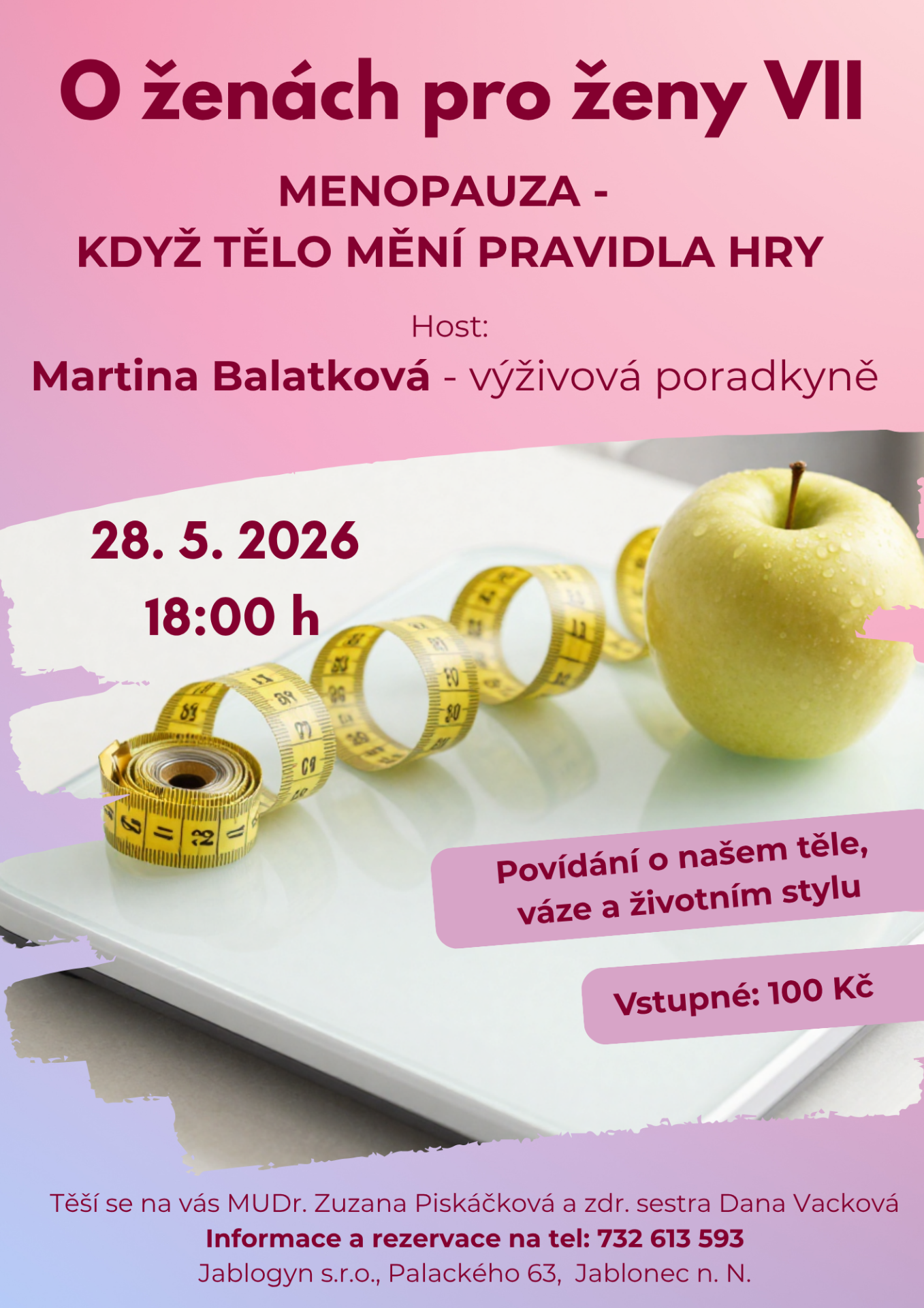 další setkání s menopauzou, tentokrát povídání o našem těle, váze a životním stylu s výživovou poradkyní Martinou Balatkovou.